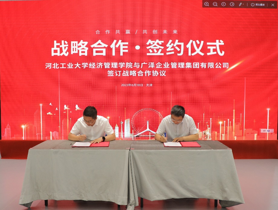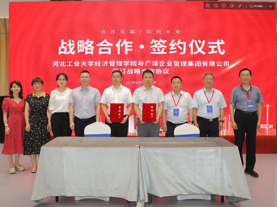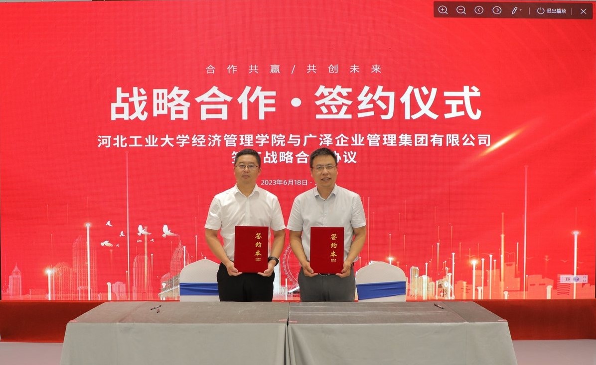 6月16日至18日,河北省商业经济学会2023年年会暨“双循环背景下的京津冀市场一体化”高峰论坛在我校举办。6月18日上午,2023年津冀高校商科院长联席会在河东区二次方城市产业园举行。期间,我院与广泽企业管理集团有限公司签订实践基地战略合作协议。广泽企业管理集团有限公司董事长孙文普、学院党委书记赵钊、副院长马苓、河北省商业经济学会荣誉顾问赵邦宏、会长孟华兴以及双方相关人员参加签约仪式。来自津冀十余所高校的经管学院院长等共50余名专家学者共同见证签约仪式。
