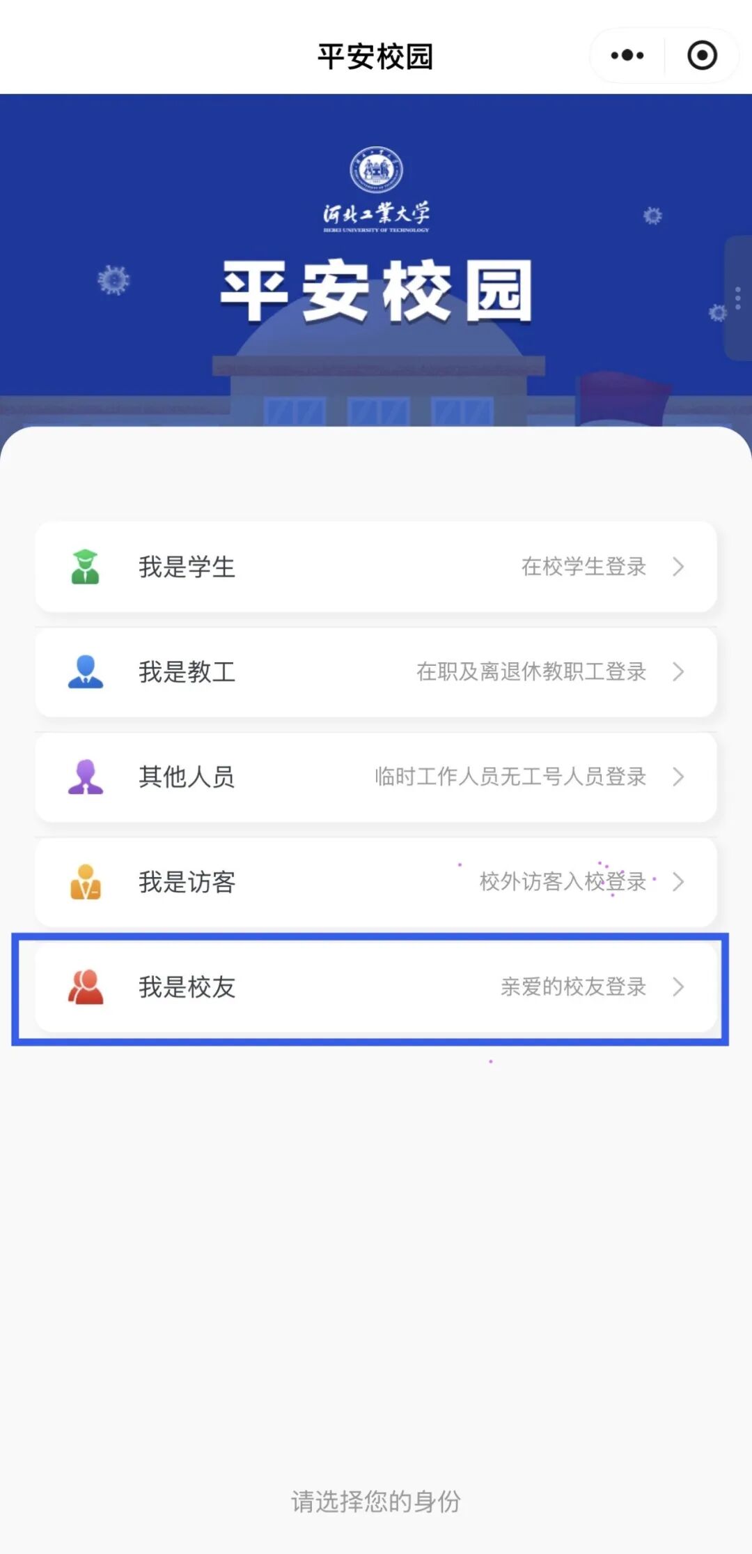 如申领校友卡过程中遇到问题无法顺利申领,可微信搜索“河北工大平安校园”小程序进行返校登记,选择校友模式-登记信息-入校申请,如有随行人员也可通过小程序选择访客模式一并进行返校登记。入校申请通过后可凭身份证出入校园。