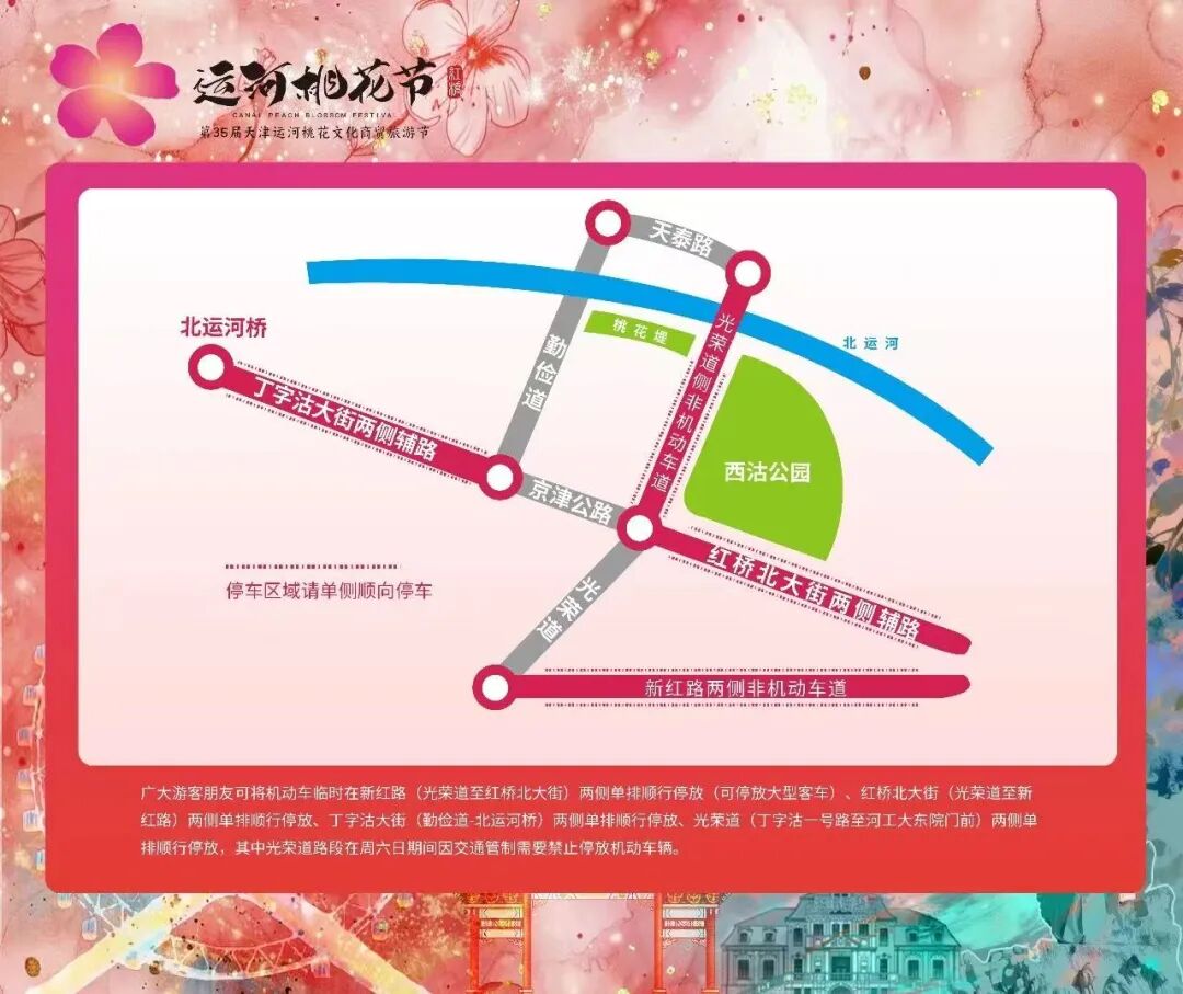 禁止机动车停放在北洋园、西沽公园正门、西沽公园东门门前,勤俭桥、北洋桥桥面和丁字沽南大街(光荣道-勤俭道)、桃花堤大道、桃花堤西道、红塔寺大道。